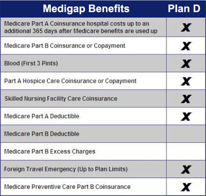 Medigap insurance Plan D is one of 10 different plans currently offered by insurance companies to cover gaps left in your Medicare Parts A and B. Each Medigap Plan offers a different array of coverage options. Here at Senior Benefits Expert, our agents will walk you through the benefits of each plan and make sure that you find the Medicare supplement coverage that best meets your needs. Contact an agent today to find for your Medicare Supplement Plan D quote.
