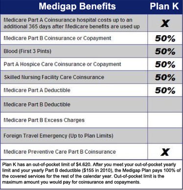 Medigap insurance Plan K is one of 10 different plans currently offered by insurance companies to cover gaps left in your Medicare Parts A and B. Each Medigap Plan offers a different array of coverage options. Here at Senior Benefits Expert, our agents will walk you through the benefits of each plan and make sure that you find the Medicare supplement coverage that best meets your needs. Contact an agent today to find your Medicare Supplement Plan K quote.