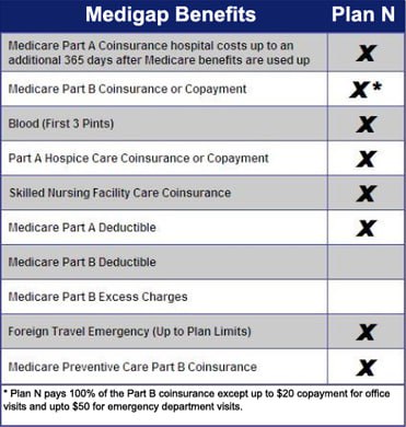 Medigap insurance Plan N is one of 10 different plans currently offered by insurance companies to cover gaps left in your Medicare Parts A and B. Each Medigap Plan offers a different array of coverage options. Here at Senior Benefits Expert, our agents will walk you through the benefits of each plan and make sure that you find the Medicare supplement coverage that best meets your needs. Contact an agent today to find your Medicare Supplement Plan N quote.